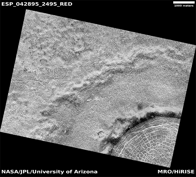 The northern crater it captured is surrounded by a ring of hills, the rim of the crater, and the shattered pattern we see in the image was caused by repeated freeze-thaw cycles in the ice.