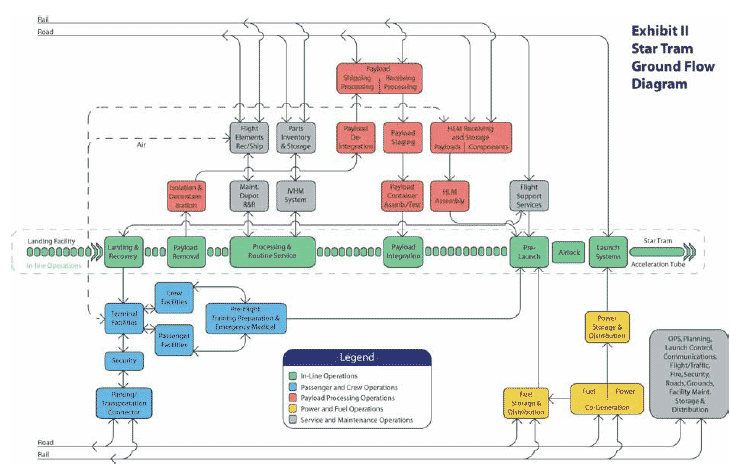 The RLV could be configured as a crewed cargo vehicle and a crewed passenger vehicle. Therefore, facilities for crew, passengers and cargo will be included. While on the ground, the RLV will be towed on its landing gear from recovery to service facilities and until it is loaded into the launch tube via an airlock. Please refer to Exhibit II, to review the Maglaunch Ground Flow Diagram.